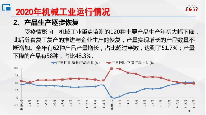 年初受疫情影響,機(jī)械工業(yè)重點(diǎn)監(jiān)測的120種主要產(chǎn)品生產(chǎn)大幅下降,1~2月僅2種產(chǎn)品產(chǎn)量實(shí)現(xiàn)增長。此后隨著復(fù)工復(fù)產(chǎn)的推進(jìn)與企業(yè)生產(chǎn)的恢復(fù),產(chǎn)品產(chǎn)量實(shí)現(xiàn)增長的品種數(shù)不斷增加。全年產(chǎn)量增長的產(chǎn)品有62種,占比超過半數(shù),達(dá)到了51.7%;產(chǎn)量下降的產(chǎn)品有58種,占比48.3%。