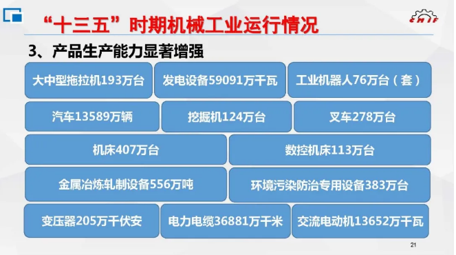 “十三五”期間,機(jī)械工業(yè)累計生產(chǎn)大中型拖拉機(jī)193萬臺、發(fā)電設(shè)備59091萬千瓦、工業(yè)機(jī)器人76萬臺(套)、汽車13589萬輛、挖掘機(jī)124萬臺、叉車278萬臺、機(jī)床407萬臺、其中數(shù)控機(jī)床113萬臺、環(huán)境污染防治專用設(shè)備383萬臺、金屬冶煉軋制設(shè)備556萬噸、變壓器205萬千伏安、交流電動機(jī)13652萬千瓦、電力電纜36881萬千米,為國民經(jīng)濟(jì)各行業(yè)提供了充足的設(shè)備供應(yīng)與保障。